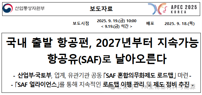 韓國強制:出境航班使用可持續航空燃料(SAF),從2027年起